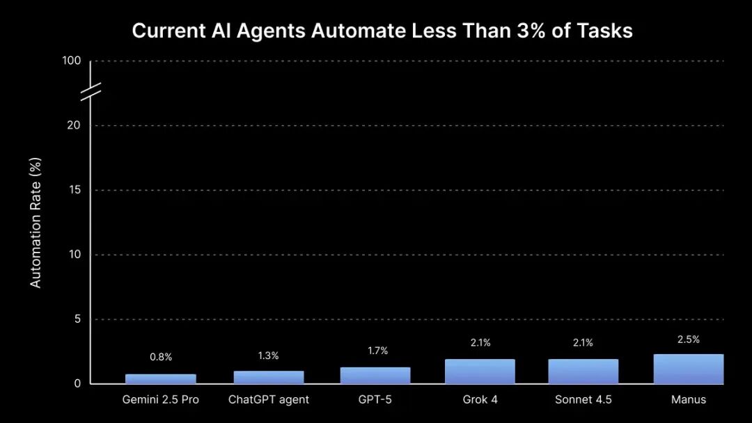 RLI实验结果显然说明“AI绝对自动化率几乎为零”,AI即将全面替代人类工作”的担忧暂时缺乏数据支撑。