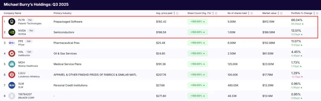 截至2025年第三季度末,该基金持有价值约9.12亿美元的500万股Palantir看跌期权和价值约1.87亿美元的100万股英伟达看跌期权。