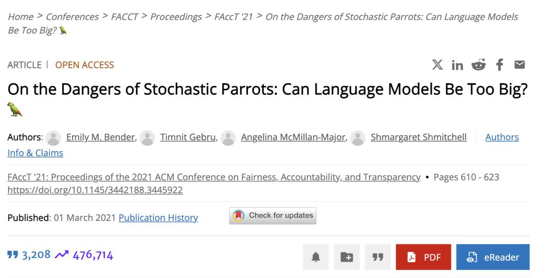 事件的导火索是Gebru与人合著的一篇论文,对谷歌赖以生存的大模型提出了尖锐批评,包括训练数据中根深蒂固的偏见,以及模型只会“模仿”而无真正理解(即“随机鹦鹉”)的危险。