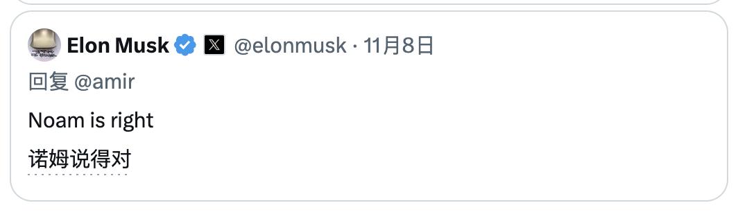 在谷歌外部,支持Noam的人也绝非少数,马斯克更是站出来挑明立场,表示Noam说的对。