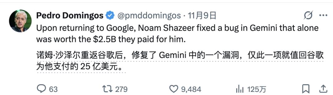 华盛顿大学计算机教授Pedro Domingos表示,单单是Noam重返谷歌后修复的一个Gemini漏洞,就已价值25亿美元。