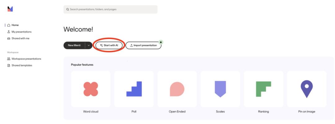 在 Mentimeter 中,用 AI 为内容生产提效主要体现在两点,从零生成内容的“Start With AI”,以及主要修改现有内容的“Suggest”,但不论哪项体验下来都有些鸡肋,并且流程上有些跑不通(此处我们就不展开了)。