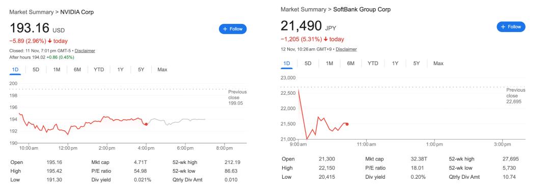 当日,英伟达股价应声下跌近3%,软银股价跌超5%。