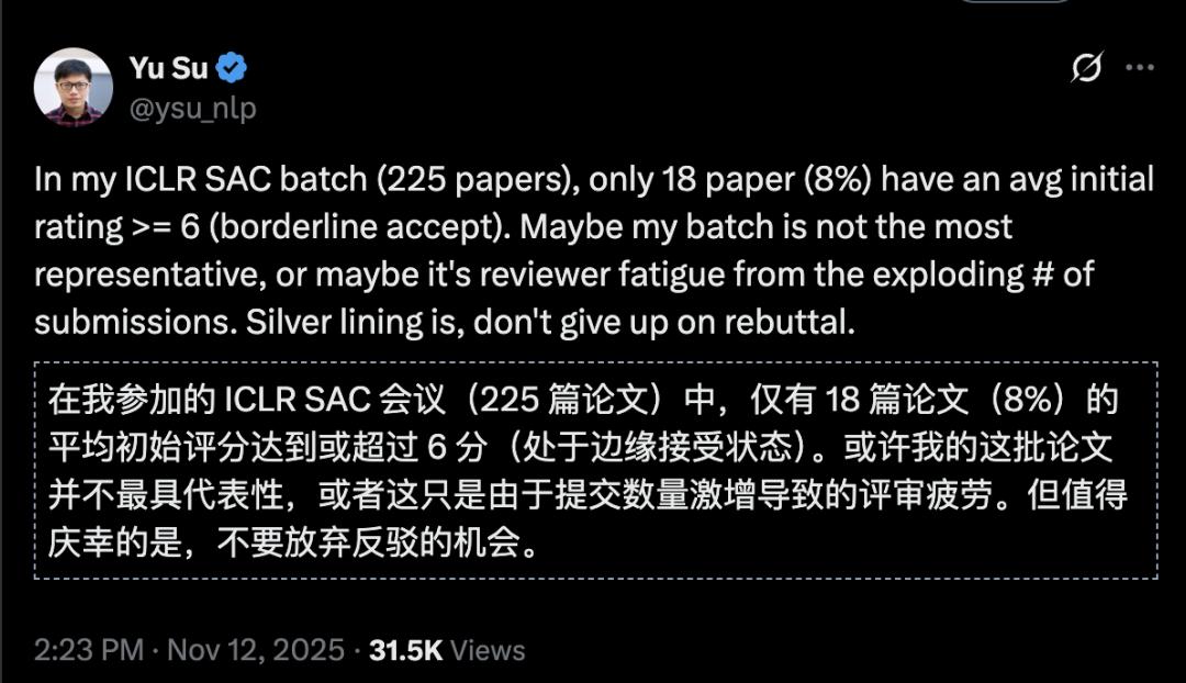 审稿人Yu Su也注意到平均分有些低,225篇论文中只有18篇论文平均初始得分超过了6分,勉强达到会议接受底线。