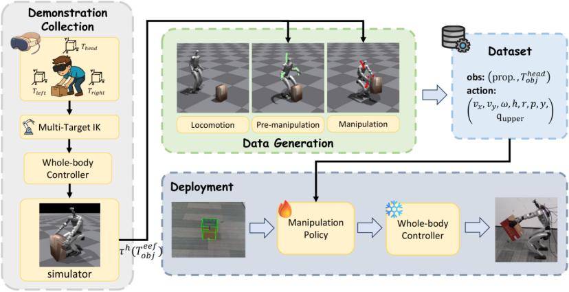 - 轨迹转换与分段:将演示轨迹拆解为“移动(Locomotion)、预操作(Pre-manipulation)、操作(Manipulation)”三阶段,并且通过坐标系转换实现泛化——