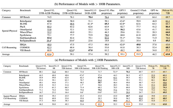 本次开源的 Pelican-VL 1.0 的核心优势在于深度整合海量数据与自适应学习机制,在由 1000+ A800 GPU 组成的集群上训练,单次检查点训练耗费超过 50,000 A800 GPU-小时;团队从原始数据中蒸馏出的包含数亿 token 的高质量元数据以做训练基石。基于上述优势,Pelican-VL 1.0 实现了在基线基础上性能提升 20.3%,平均超过 Qwen3-VL 系列、InternVL3.5 系列等同级别开源模型 10.6%。