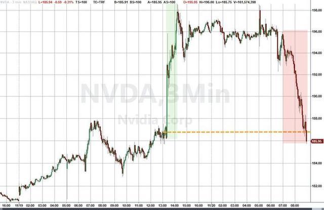周四英伟达股价盘中反转走低,此前该公司发布的超预期财报曾一度推动股价上涨5%。