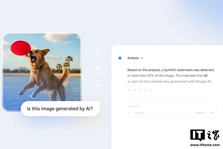 IT之家 11 月 20 日消息,谷歌正让 Gemini 用户能更轻松地检测部分 AI 生成内容。即日起,用户可以使用 Gemini 应用来判断一张图片是否由谷歌的 AI 工具创作或编辑,只需问 Gemini“这是 AI 生成的吗?”即可。