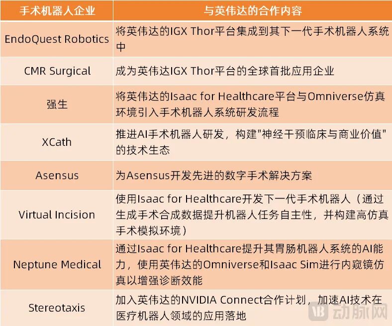 此外,强生、XCath、Asensus、Moon Surgical、Virtual Incision、Neptune Surgical、Stereotaxis等手术机器人企业均与英伟达达成了合作。