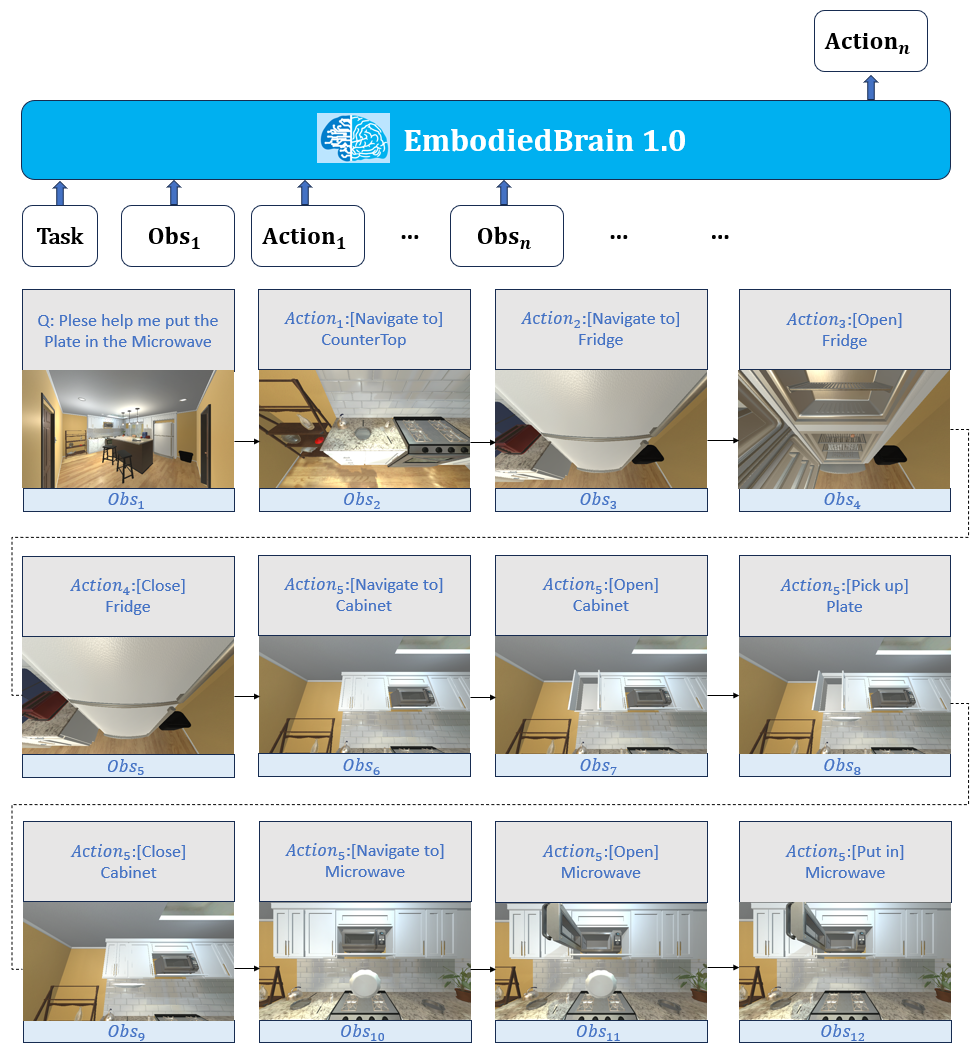 图 3:EmbodiedBrain 实时规划能力展示:“在开放的厨房中找到盘子并放入微波炉”