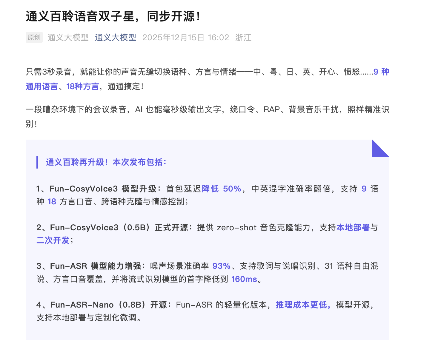 此外,通义推出轻量化版本Fun-ASR-Nano模型,总参数量压缩到0.8B,推理成本更低,现已开源,支持本地部署与定制化微调。