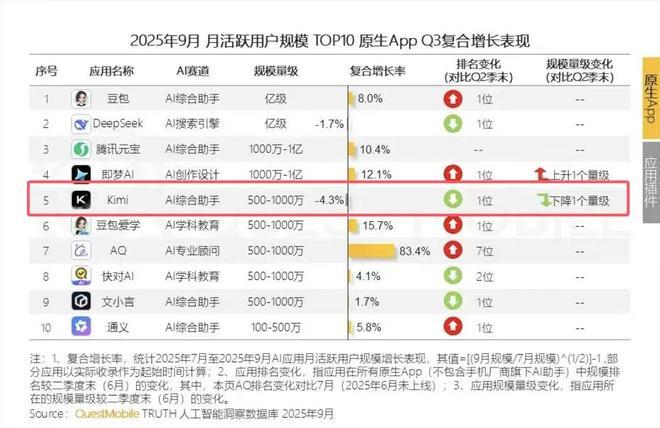 今年9月,Kimi月活跃用户只有967万,在纵向对比中,仅为九个月前的46%,在横向对比中,在原生AI应用中排名第五,月活分别只有豆包和DeepSeek月活规模的5.6%、6.7%。