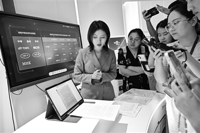 一名工作人员在科大讯飞人工智能体验馆介绍AI学习机的批改作业功能。