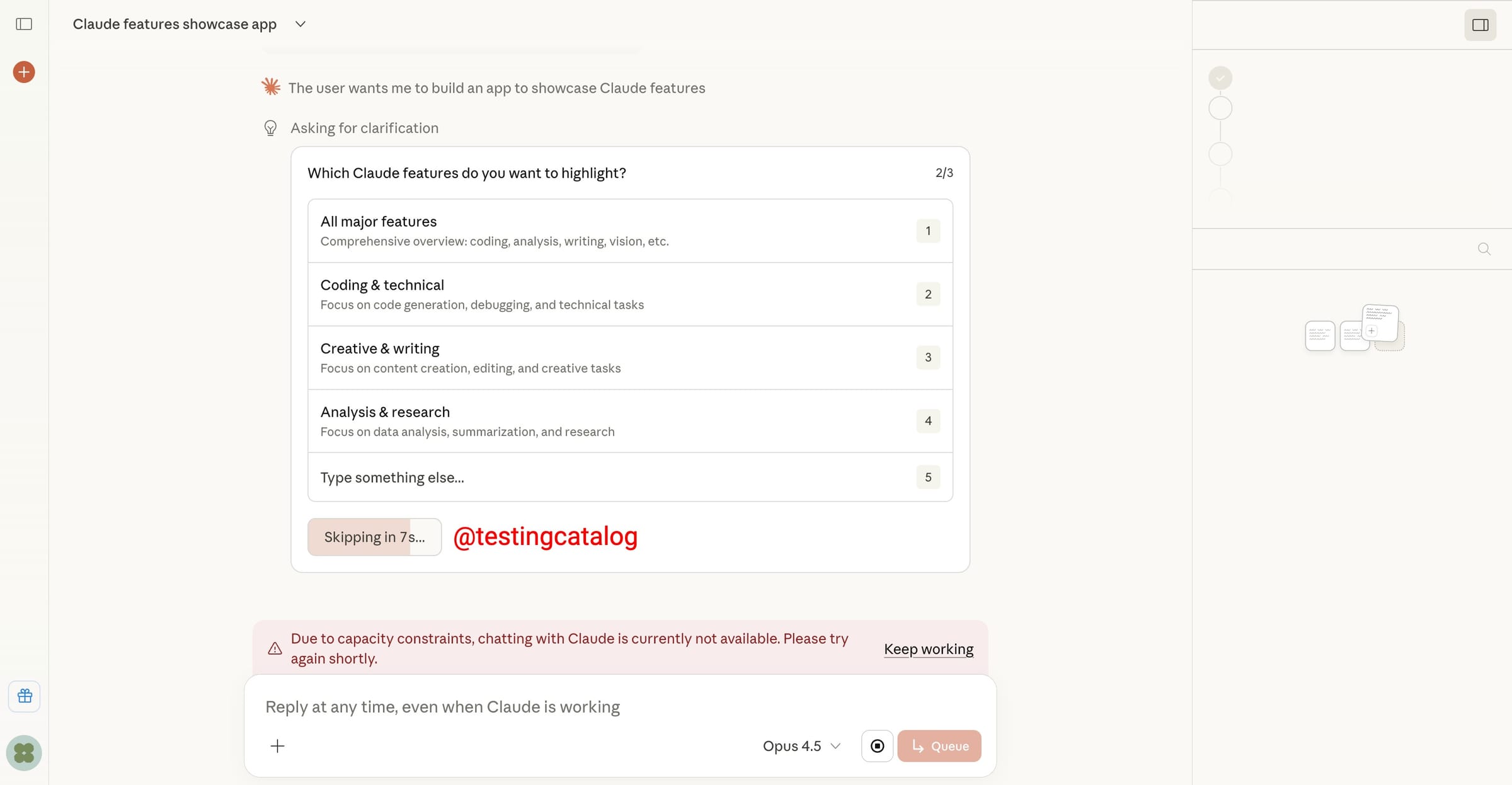 在处理复杂需求时,Claude 不再盲目执行,而是先生成一份结构化的“行动计划”(Action Plan)。如果指令模糊,系统确保准确性,会主动发起“澄清性提问”(Clarifying Questions);若用户未在规定时间内回复,系统则会智能跳过该步骤继续执行。