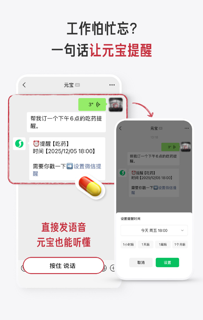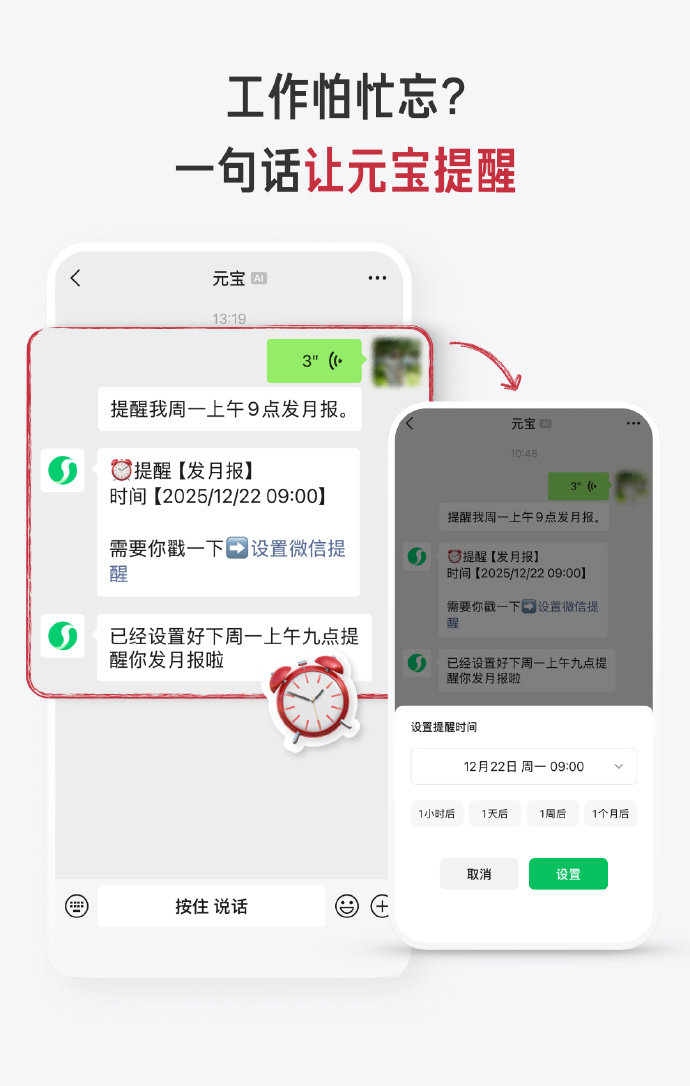 IT之家 12 月 19 日消息,今日,腾讯元宝宣布上线新能力,支持一句话在微信内设置提醒。用户只需向元宝发送一句包含事项和时间的消息,元宝即可自动识别任务内容,并在指定时间通过微信服务通知进行提醒。