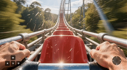一个极速飞驰的过山车,手握冰凉的金属扶手,有呼啸的风灌进喉咙,一阵失重感突然袭来,还有快速掠过的模糊树影,以及头顶刺眼的阳光,第一视角体验很刺激,写实风格