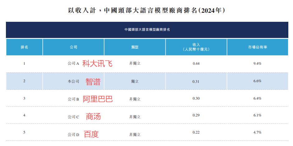 根据沙利文报告,2024年智谱总营收3.12亿元,在中国大语言模型厂商中排名第二,市占率6.6%,超过阿里巴巴。