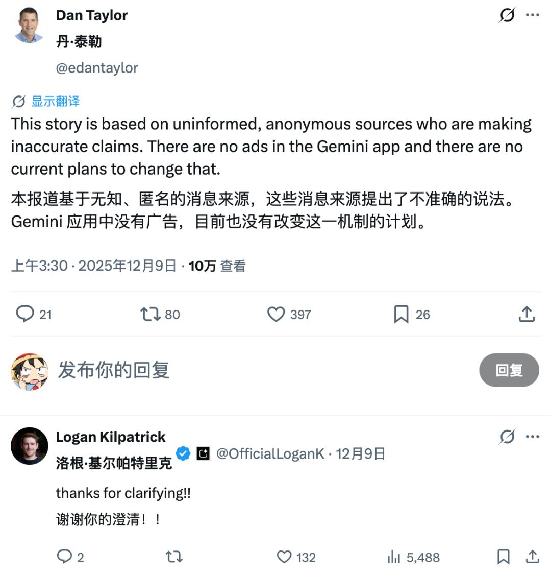 但很快,Google 全球广告部负责人 Dan Taylor 在社交媒体上直接否认了这一说法,称「Gemini App 目前没有广告,也没有当前计划改变这一点」。这说明,Google 至少在公开语境里是保持谨慎的。