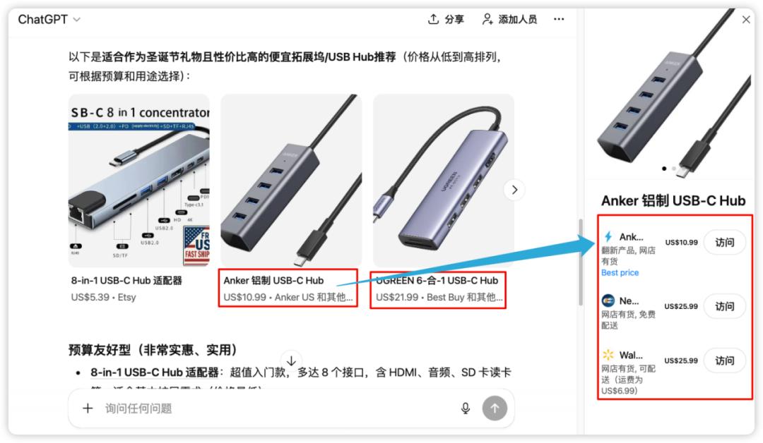 这意味着一次原本可能在站内“产生多次广告曝光和点击收益”的购物行为,被ChatGPT提前“截胡”了。