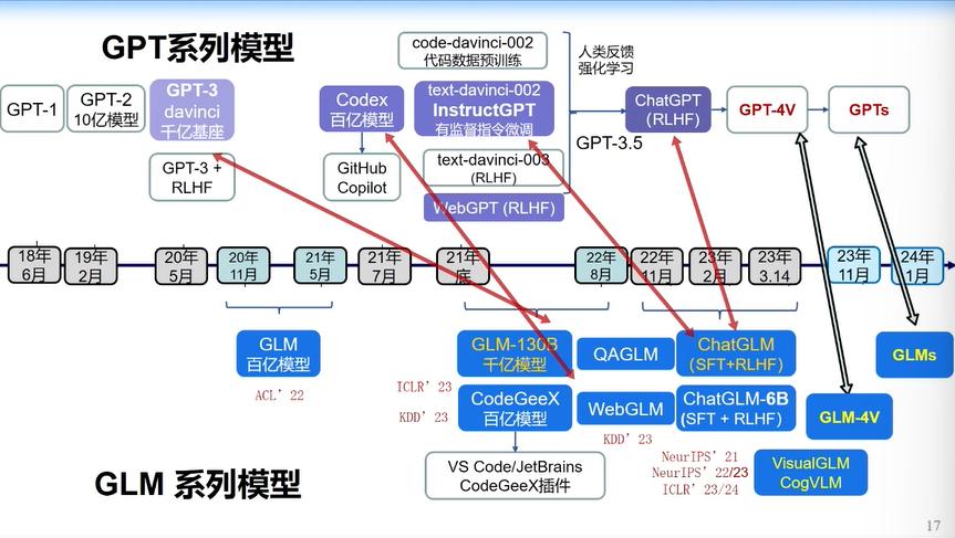 GPT、GLM模型发展脉络图,图片来源:唐杰《ChatGLM:从大模型到AGI的一点思考》演讲PPT