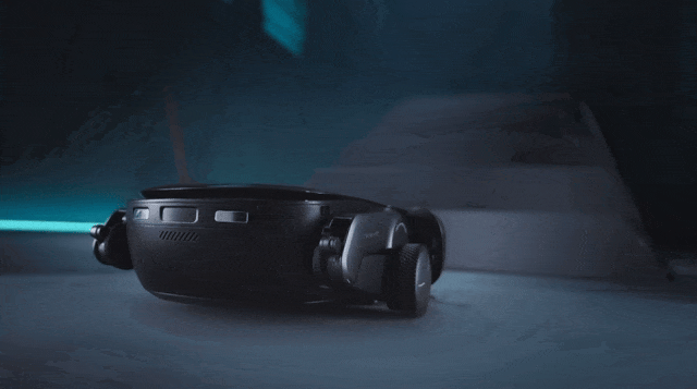通过“轮 + 腿”的结构设计,机器人不再受限于传统扫地机器人的二维平面移动,而是引入了接近人类行走逻辑的三维运动能力。每个轮腿都具备独立的伸展、抬升与升降能力,因此它可以像人一样在楼梯和斜坡上导航清洁,完成抬腿、落脚、转向、急停等连续动作,并在地形变化过程中始终保持机身水平。