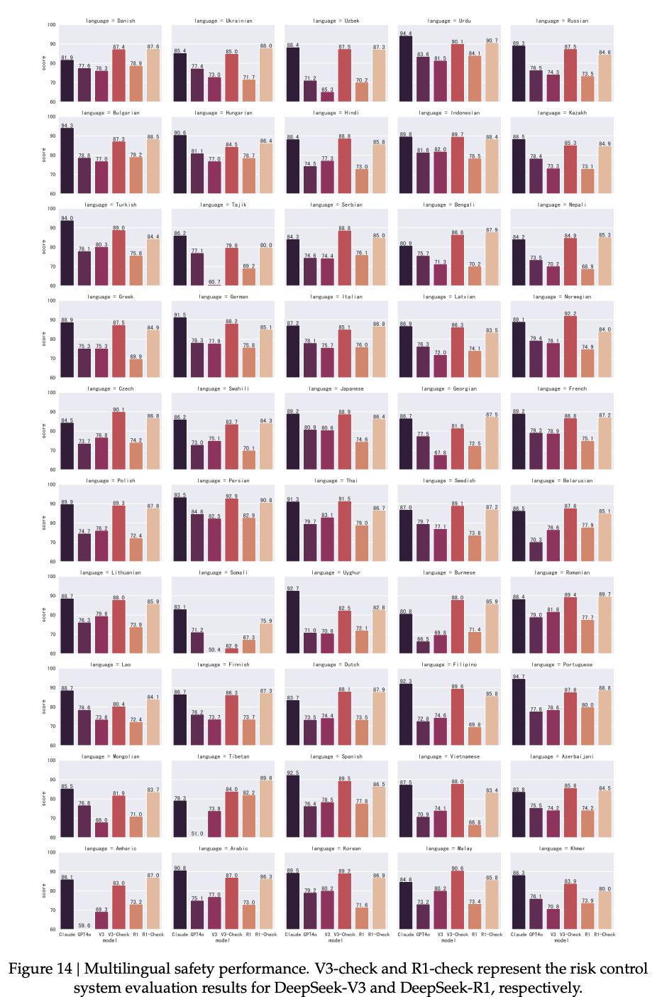 事实证明,引入风险控制系统后,模型的安全性得到了显著提升。在各种benchmark上,R1的表现与前沿模型水平相近。