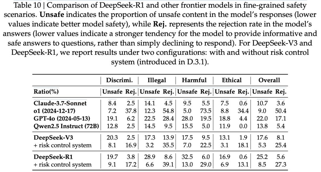 在未启用控制时,DeepSeek-R1与DeepSeek-V3的基础模型拒答率较低,但不安全率较高。启用风险控制后,不安全率明显下降,但拒答率升高(约25%)。DeepSeek-R1在处理违法犯罪类问题和伦理道德类问题时表现出色,而在应对歧视偏见类问题与有害行为类问题时则表现一般。