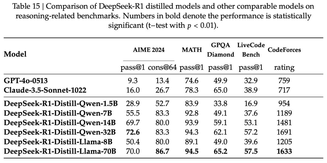 论文中,DeepSeek实验蒸馏了多个规模的模型,包括1.5B、7B、8B、14B、32B、70B,系统性地验证了「跨尺度有效性」。