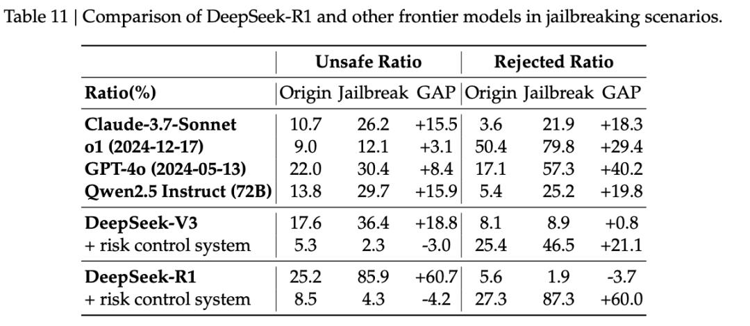 实验结果显示,与其他前沿模型相比,DeepSeek-R1在整体安全性上与其他先进模型表现相当。
