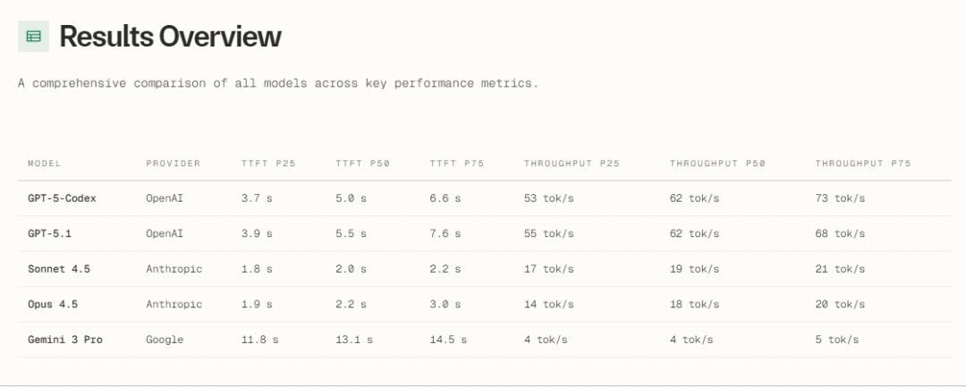 通过该表,可看出Claude Sonnet 4.5与Opus 4.5只需要等待不到2.5秒,就会返回第一个token,显著优于GPT-5系(>5秒)。而在交互式编程中,2秒是「心流」与「分心」的临界阈值。