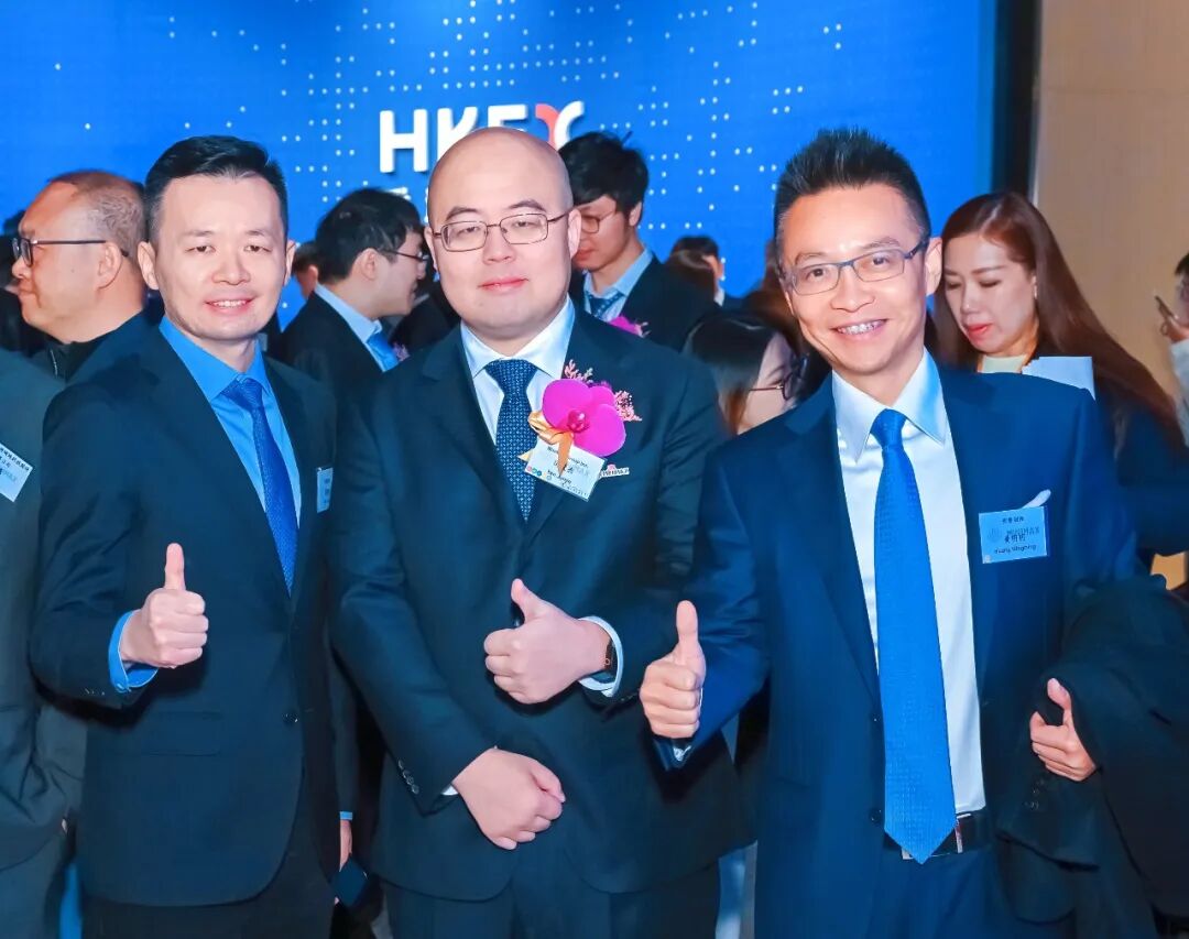 MiniMax 创始人兼 CEO 闫俊杰(中)与明势创投创始合伙人黄明明(右)、明势创投合伙人夏令(左)在MiniMax港交所主板上市仪式上