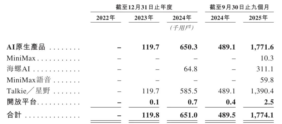 MiniMax的AI原生产品的付费用户数从2023年的约119,700名增至2024年的约650,300名,并于截至2025年9月30日止九个月进一步增至约1,771,600名。