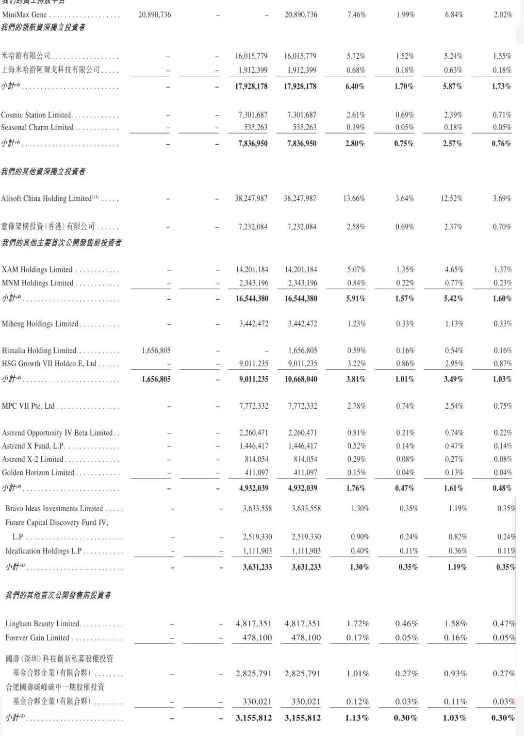 米哈游有限公司持股为5.24%,有1.55%投票权;上海米哈游阿尔戈科技有限公司持股为0.63%,有0.18%投票权;米哈游一共持股5.87%,有1.73%投票权;Cosmic Station Limited持股为2.39%,有0.71%投票权;Seasonal Charm持股为0.18%,有0.05%投票权;