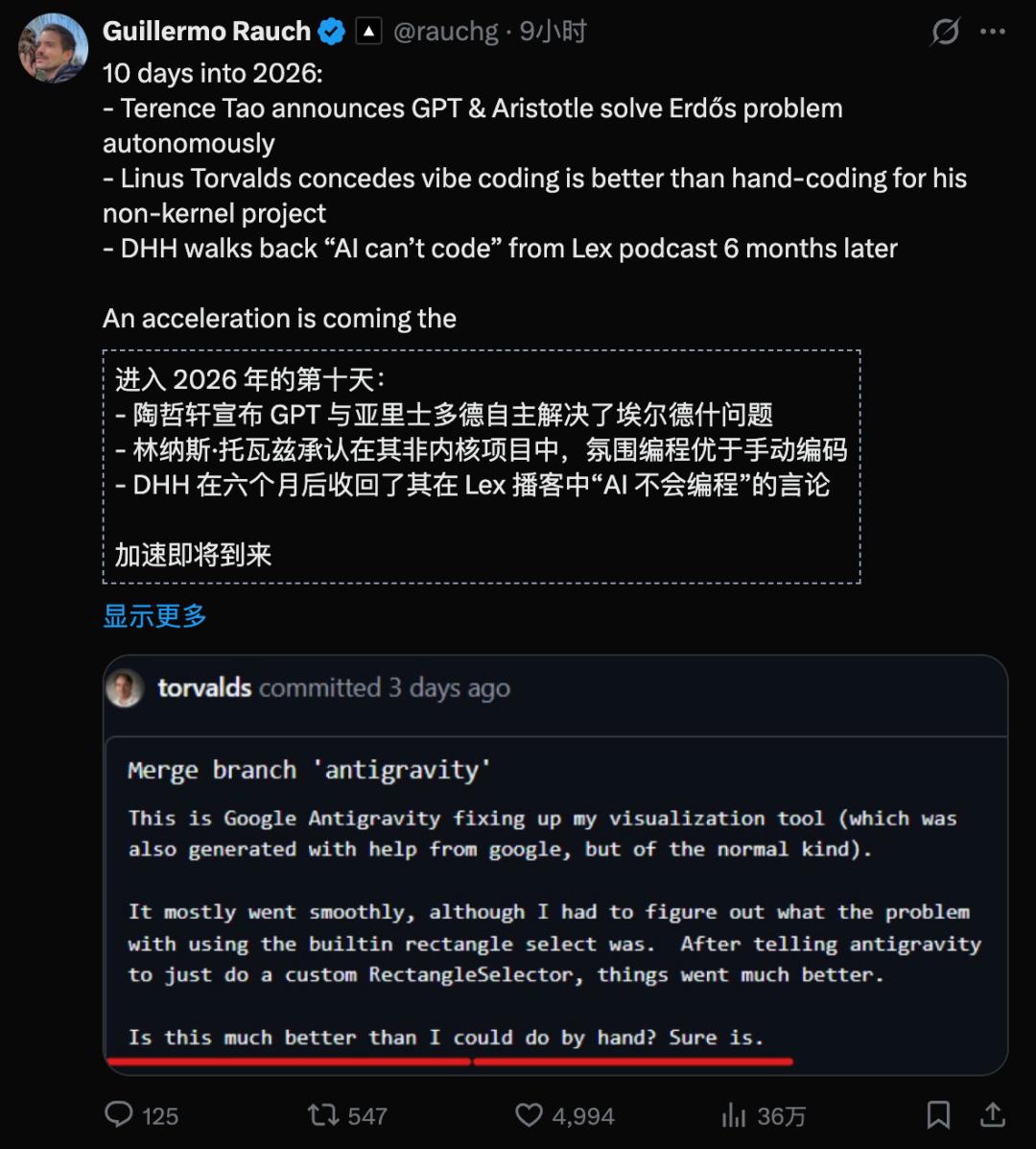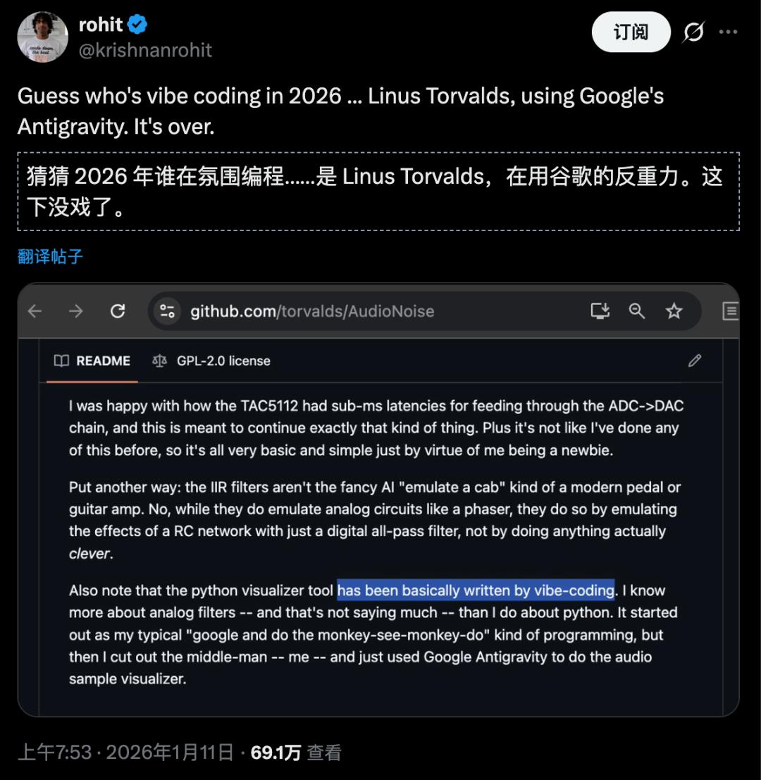 「猜猜2026年谁在氛围编程……是Linus Torvalds,在用谷歌的Antigravity。这下没戏了(It's over)。」