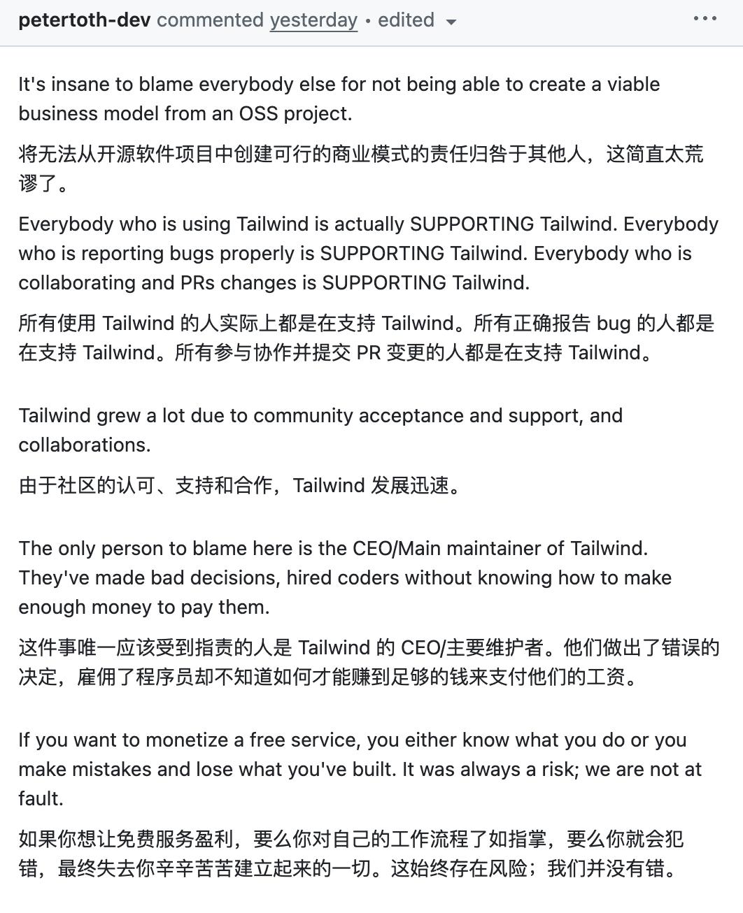但依然有老用户觉得受到了欺骗,无法接受本就是被开源社区捧起来的Tailwind,如今却以「盈利」为由,拒绝为开源项目做贡献。