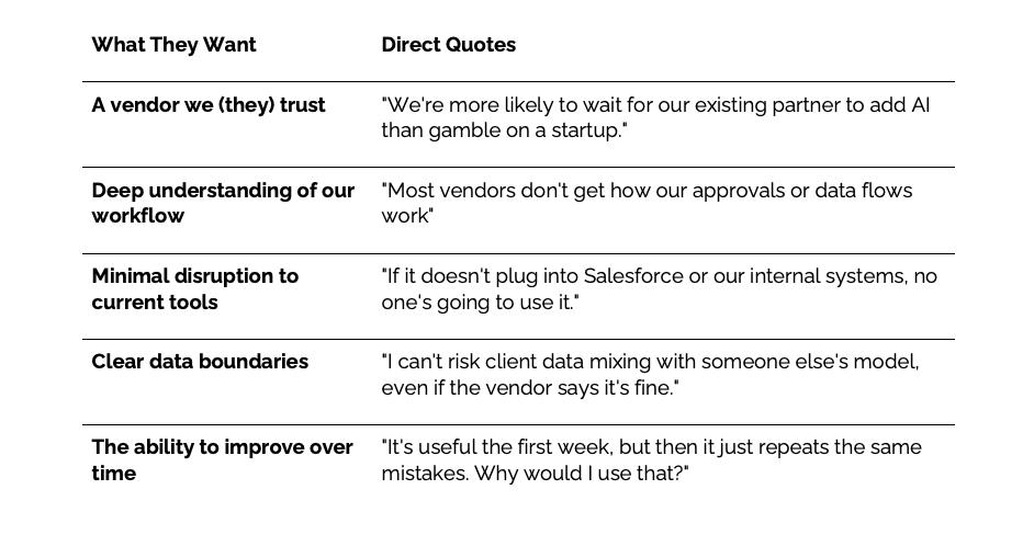 许多公司在尝试内部自研 AI 时,都会走上这样的弯路:系统过于复杂、为了 AI 而 AI,与实际业务流程脱节。正如一位接受调研的首席信息官所言:「我们今年看了几十个 AI 产品演示,可能只有一两个是真正有用的,其余不是华丽包装就是纸上谈兵」。这种脱离实际的现象导致企业投入的 AI 项目无法落地,ROI(投资回报)自然无从谈起。