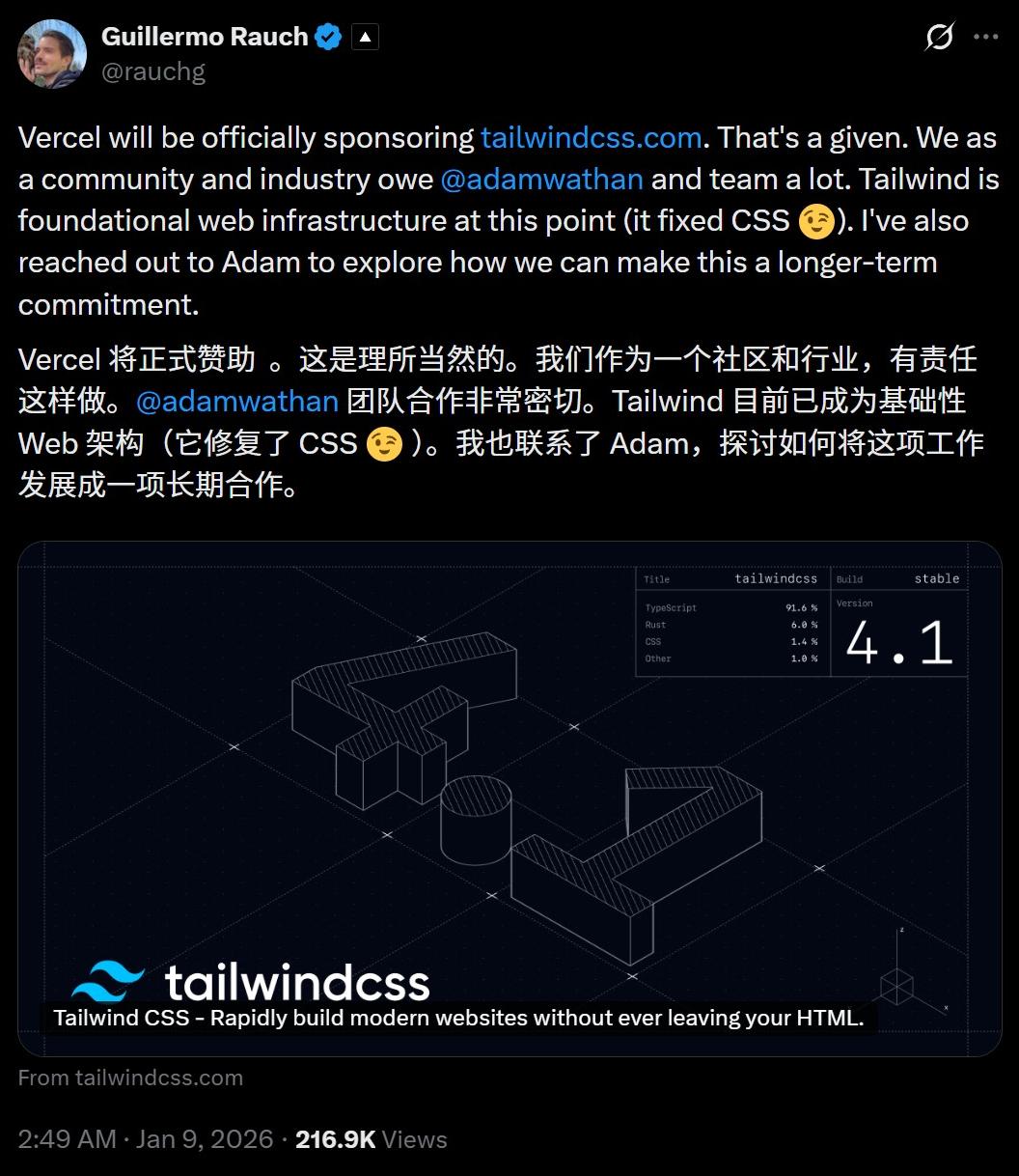 紧接着没过多久,Vercel CEO也宣布,Vercel将正式赞助Tailwind!