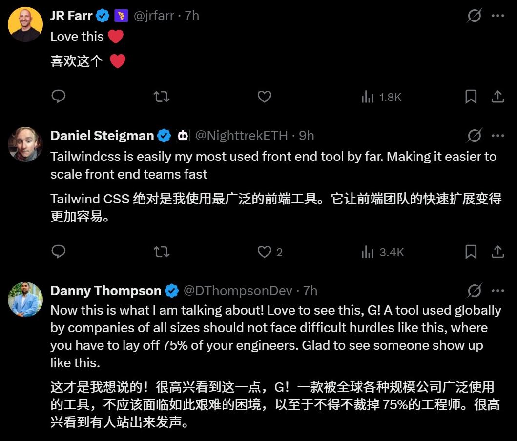 他表示,就在本周一,Tailwind正式裁掉了75%的工程团队。