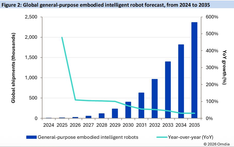 在具身智能领域,中国展现出软硬协同的产业链优势。Omdia数据显示,2025年全球人形机器人出货量约1.3万台,前十厂商中六家来自中国。报告预测2035年出货量将达260万台。该领域主要看两条主线进展:一是“大脑”,新型模型架构或于2026年下半年出现突破;二是灵巧手,目前仿生手研发“每个关节都很灵活,不同关节中用的 钢材料也不一样,远超 外 界想象”。