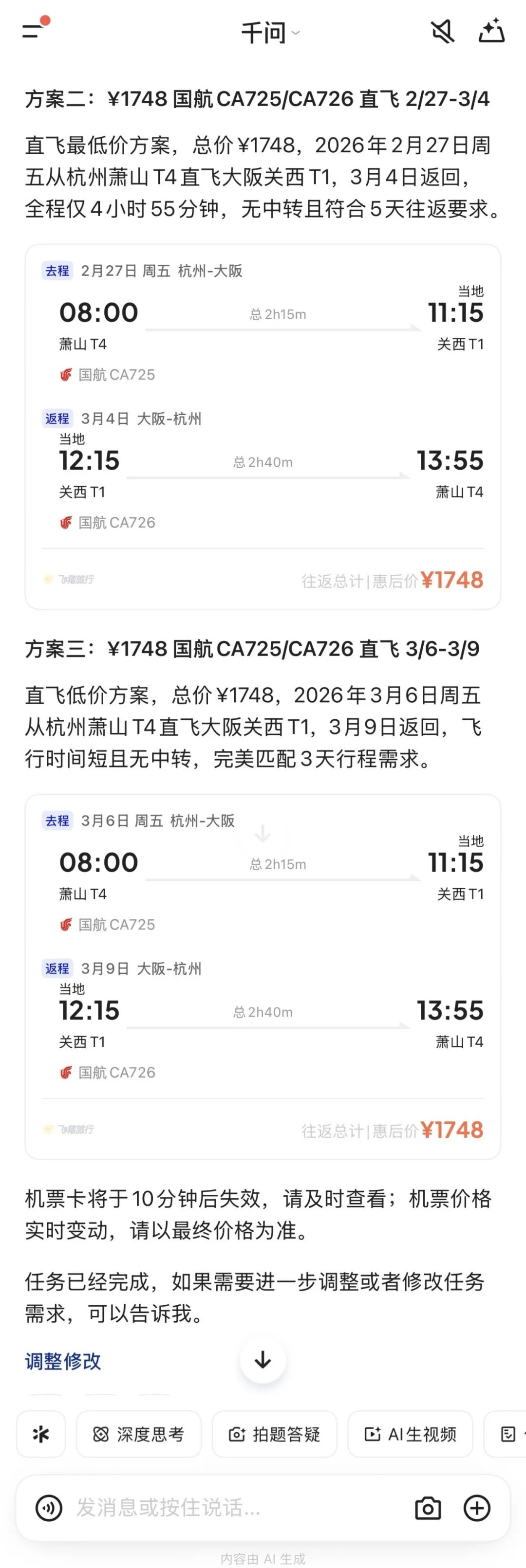 也可以用千问来整理旅行路线。跟飞猪和高德联动后,效果大有改观。像我的需求是: