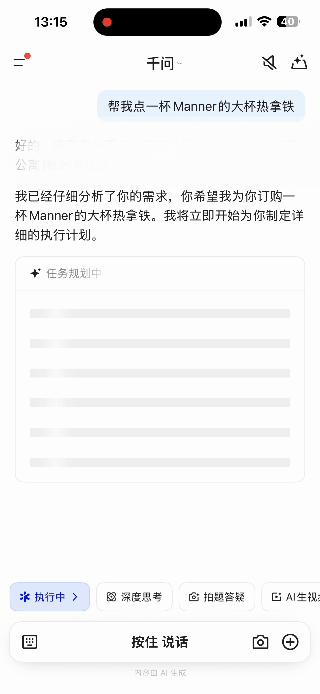 4. 可以直接用千问来订一杯咖啡。像我日常就是喝 Manner,让千问联动淘宝闪购,就能直接帮我点一杯热拿铁。不用再打开外卖界面、搜索咖啡、打开 Manner 店铺、找到拿铁、选择规格,最后下单。
