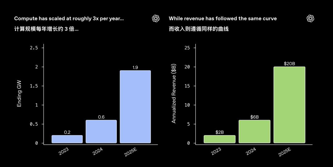 过去三年里,OpenAI的算力逐年增长,从最初的200兆瓦增长到1.9吉瓦,收入也相应地从20亿美元增长到超过200亿美元。