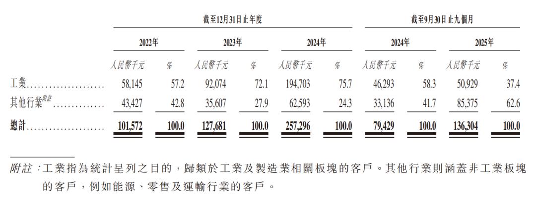 按行业划分,2022年、2023年、2024年全年及2025年前九个月,极视角在工业领域的收入占比分别为57.2%、72.1%、75.7%和37.4%;在能源、零售、运输等其他行业的收入占比分别为42.8%、27.9%、24.3%及62.6%。