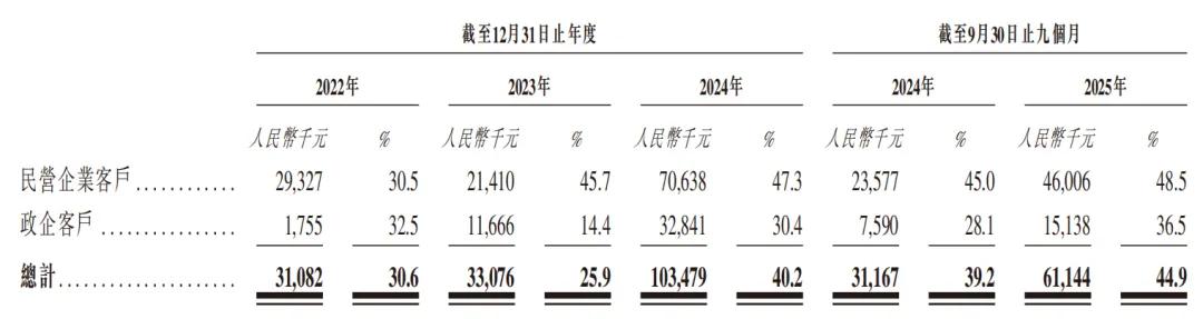 按客户类型划分,2022年、2023年、2024年全年及2025年前九个月,极视角在民营企业客户的毛利率分别为30.5%、45.7%、47.3%及48.5%;政企客户收入占比分别为32.5%、14.4%、30.4%及36.5%。