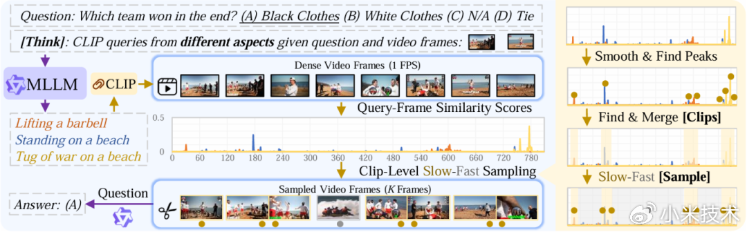 为此,小米大模型团队与中国人民大学高瓴人工智能学院联合提出了一种无需训练的帧选择框架 Think-Clip-Sample(TCS),通过多查询推理(Multi-Query Reasoning)和片段级慢快采样(Clip-level Slow-Fast Sampling)两大核心机制,显著提升了 MLLMs 在长视频问答任务中的准确性与效率。