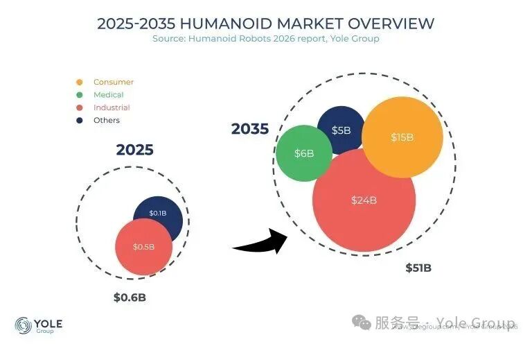 Yole Group在其报告《仿人机器人2026》中表示,到2025年,市场规模预计将达到约6亿美元,虽然仍属小众,但潜力巨大。未来五年将是关键成长期,年复合增长率(CAGR)高达56%。到2030年,市场规模有望超过60亿美元。此后市场仍将以55% CAGR持续增长,并在2035年达到510亿美元。