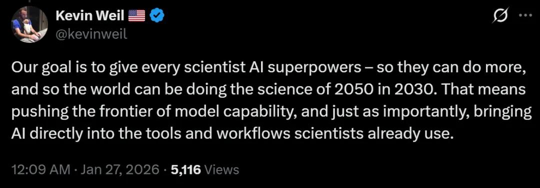 而在昨日,OpenAI 副总裁、新成立的 OpenAI for Science 团队负责人 Kevin Weil 就在 X 上发文预热道,“我们的目标是赋予每位科学家 AI 超能力,让他们能做更多事情,让世界在 2030 年就能开展 2050 年的科学研究。”