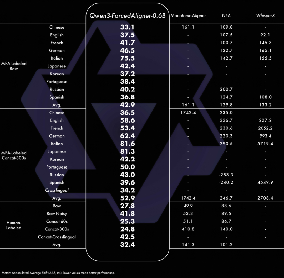 独创且强大的强制对齐模型:我们推出 Qwen3-ForcedAligner-0.6B,一个支持 11 个语种在 5 分钟之内语音的任意单元的时间戳预测,经评测其时间戳精度超越了一众基于传统端到端方案的强制对齐模型,其非自回归的推理逻辑保证了推理的高效性。