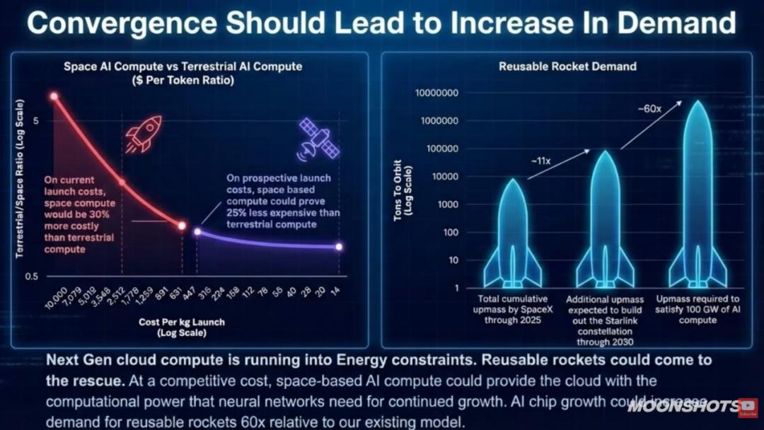 他总是问:根本性的约束是什么?真正的物理障碍是什么?其实很简单:沙子(硅)的获取非常便宜;至于电力,太空中太阳能板的效率是地面的六倍,成本极低。所以我认为,如果我们今天只看发射成本的下降,而不考虑GPU成本、电力成本和太阳能板生产成本的趋同性颠覆,那我们就低估了趋势。如果埃隆是对的,这些都会在短短几年内并行发生,成本曲线会急剧下降。