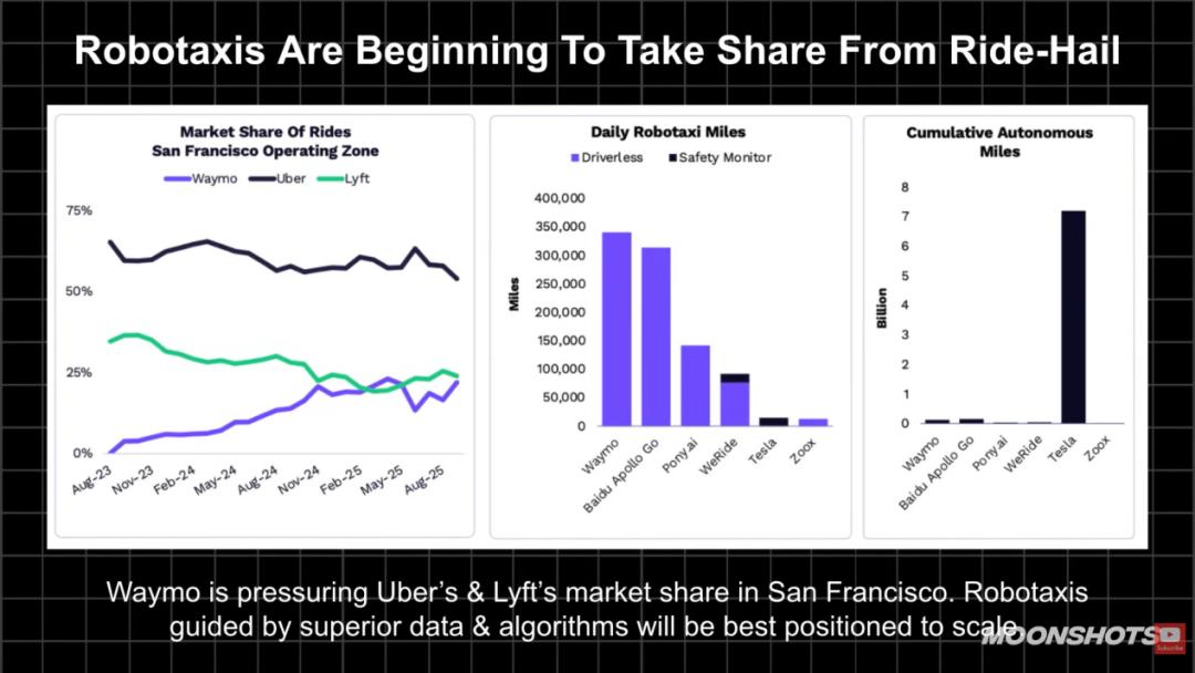 数据显示,Waymo的份额正在上升,而Lyft和Uber在下降。我们在圣塔莫尼卡出差时,往返机场或送孩子上学的路上,平均每天能在街上看到10到12辆Waymo。我认为大约在四五年后,80%的车辆将是自动驾驶汽车。你们怎么看?
